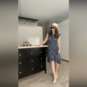 Flutter sleeves and an allover botanical print. Included coordinating fabric belt for waist. Fully lined. Poly, spandex. 21.5” across bust and 46” long.