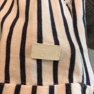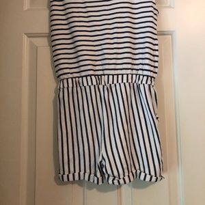 This is a super comfy, girls navy and white striped romper. Has pockets and you can cinch the waist. Also has silver buttons on one shoulder. Gently used, in great condition, no flaws, from a smoke-free, pet-free home.