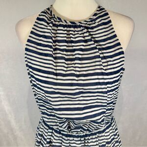 Halter style top with keyhole button back. Elastic banded at the waist. Lined. EUC