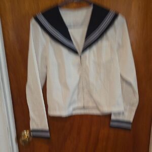 Adorable navy and cream sailor uniform. Features a classic sailor collar and pleated skirt. size small-tween