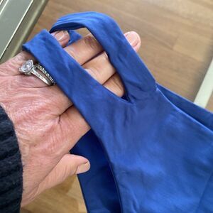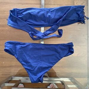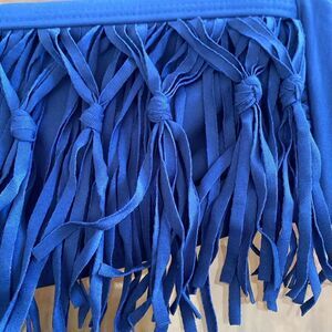 Navy blue Bando top low rise bottoms slit on the sides, fringe macramé accent
