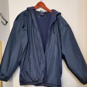has an interior pocket, zip closure, hood, and pull cords to cinch bottom of jacket