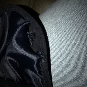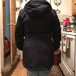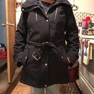 Used MK navy blue coat. Only wear and tear is a hole in right side pocket. Hood fold and zips away. As is.