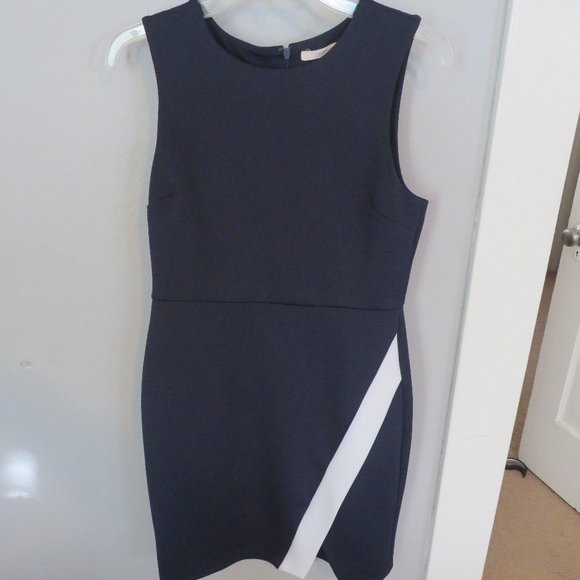 This is a mostly navy dress with a white strip of fabric along the front part of the skirt. It leads to a slit in the skirt that is quite stylish. The neckline is between a crew neck and boatline neckline. The bottom of the hem comes above the knee. The shell is 95% polyester and 5% spandex, so it is stretchy and has some give for movement. The lining is 100% polyester. It is in great condition.