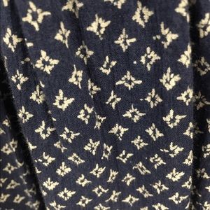 This skirt is short and patterned with little white flowers on a navy blue background. It has a stretchy elastic waste. It's a skater style skirt. It's chiffon but not see though, as it has two thin layers.