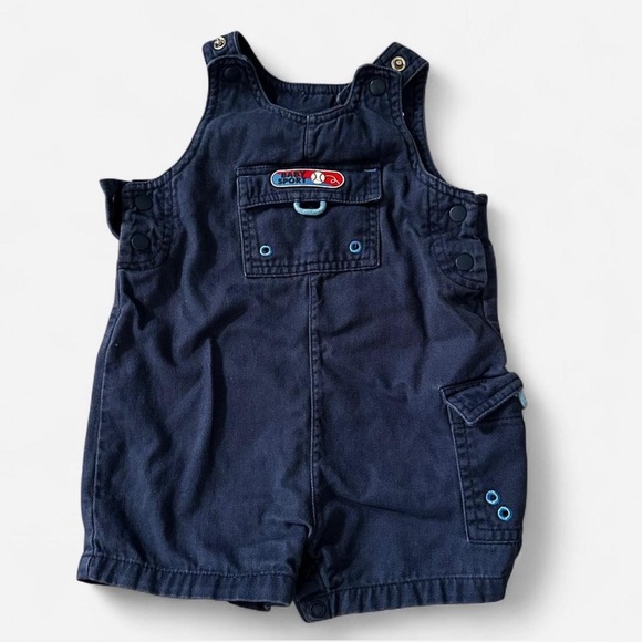 Navy blue baby sport vintage overalls with embroidered logo and snap buttons