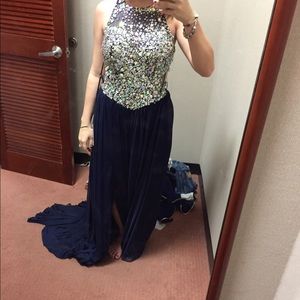 Navy blue backless prom dress. I had this dressed hemmed because I'm super short so it is already a great length for someone that's about 5 foot, but no worries, if you aren't 5 foot or near that, I can take the hemming out. :)