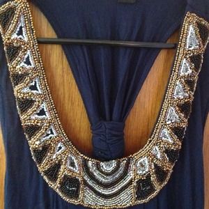 Low razorback navy blue top. Black, gold, silver, brown, and white beading along the neck line.