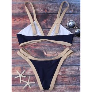 Brand new navy blue/beige bikini. Runs small. Size medium would fit as a size small.