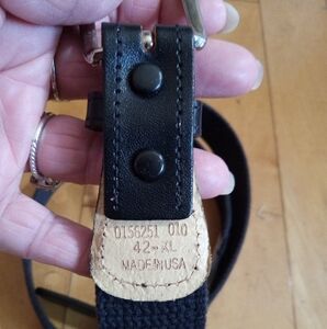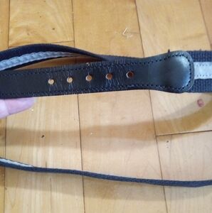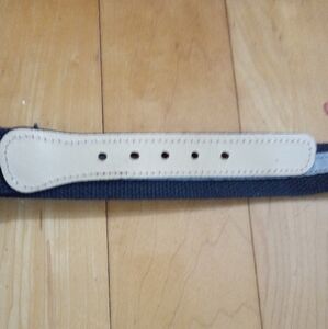 Navy blue canvas belt with silver reflective stripe and leather buckle holder and fastener in size 42XL. Great pre-owned condition with minimal wear to leather, see pics please.