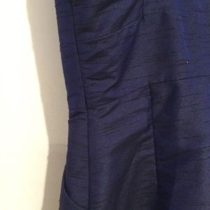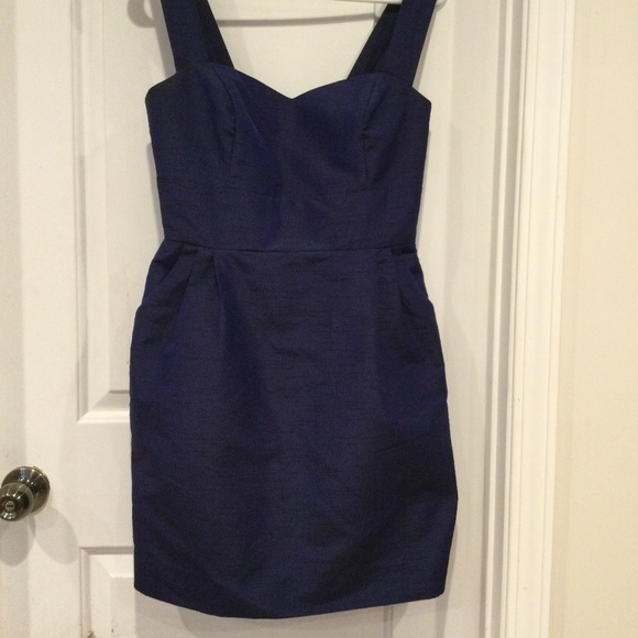 Structured dark blue fabric. Pockets on both sides. Striped shoulders, zipper on side