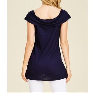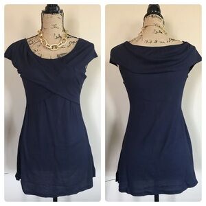 Navy blue lightweight knit top features a round neckline and front crossover panels. Fitted shape. 95% rayon 5% spandex. Made in πΊπΈ. S(0-4), M(6/8), L(10/12). Approx measurements,
