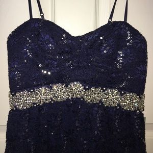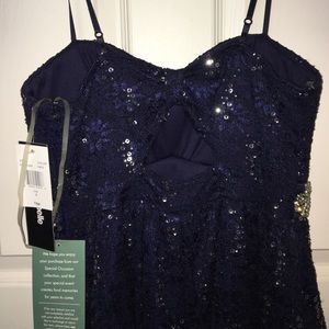 Gorgeous navy blue dress. Sweet heart neckline with adjustable straps. Cutout in back. Has lace with sequins all around it. NEVER WORN WITH TAGS. *Willing to negotiate price*