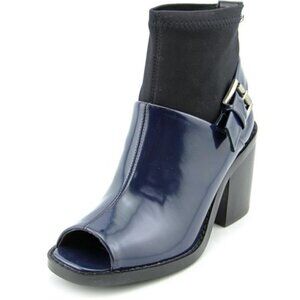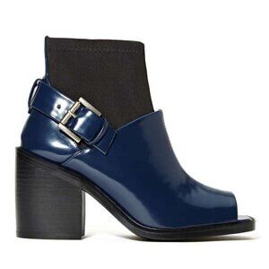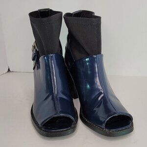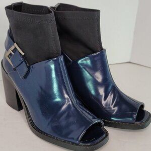 We know you love your black boots, but these navy box leather ones by Shellys London are the not-so-basic boot you've been looking for. They have a peep toe, stretch band at the ankle, and silver buckle closures at the side. Stacked heel, genuine leather lining shells