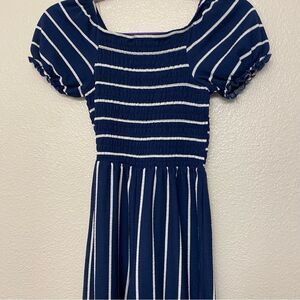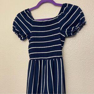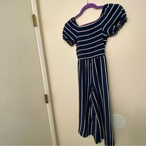 Navy blue puff sleeve wide leg smocked Striped stretchy Jumpsuit Romper 10-12
