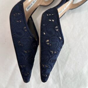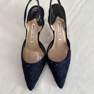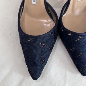 Satin slingbacks, trim and heel. Cutout area appearss to be satin as well but may havee some linen detailing. See photos. Minimally worn