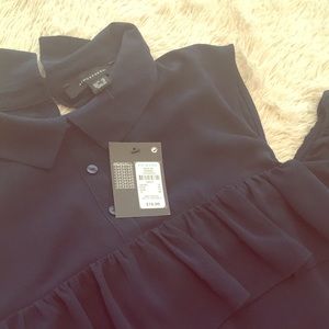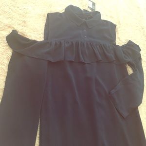 Ankle length Navy Blue dress with the shoulders cut out. Buttoned up and ruffled. Perfect for a day out as is, or a night on the town with a jacket.