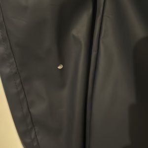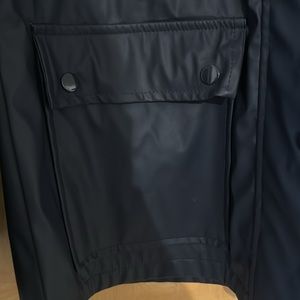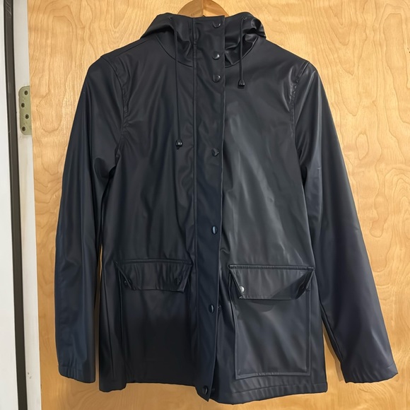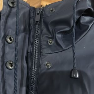 The item is a small navy blue rain coat from aqua. Lightly worn though there is a small white mark on the back of the left sleeve. Full zip with hood and buttons along with two from button pockets. The inside is striped white and blue cloth.