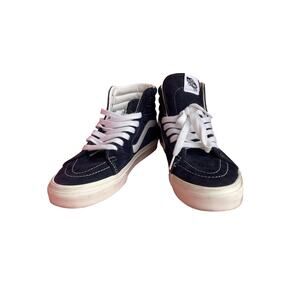 I wish these fit me! Excellent condition, dark navy blue suede that is water-repellant and treated with a Dupont product that makes them last a lot longer and the suede stays fresh. Classis SK8 high skate shoe/ sneaker. White trim and accents. Marked a men's 7.5, Women's 9. Excellent condition.