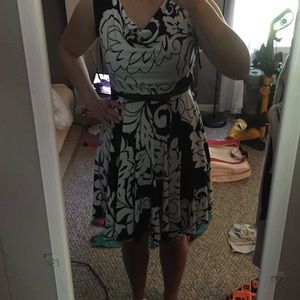 Flowy floral navy blue and white dress. Flattery on any body type. Size 4 valerie bertinelli knee length dress