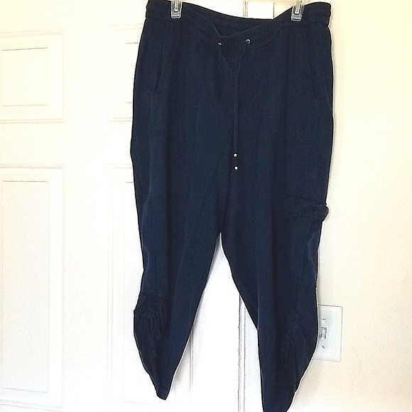 Navy capri elastic waste, tie in front. 100% Lyocell, feels like rayon. Scrunch bottom on side with ties
