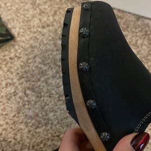 Very cool, studded navy clogs wooden heel with rubberized sole size European 38 great condition from and made in Switzerland