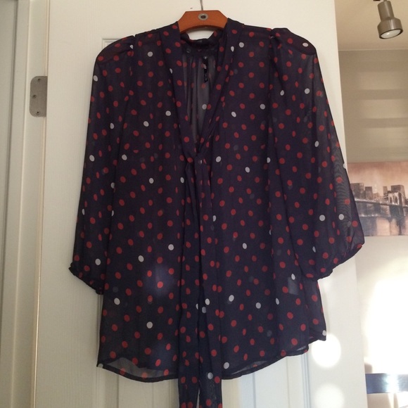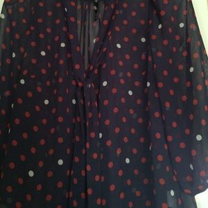Navy, coral and white semi-sheer polka dot blouse with bow around neckline. Worn one time. Sleeves hit mid forearm.