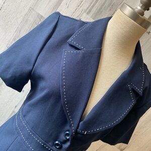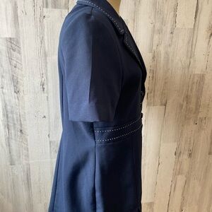 Navy blue button up collared dress by “Sweet suite” in size 12. White top stitching on the collar and waistband adds a classic touch. Good condition.