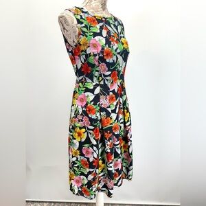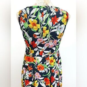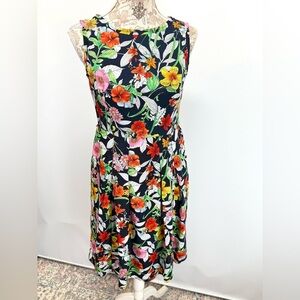 Navy blue sleeveless JONES NEW YORK Dress size 4P. Has floral pattern with poppy reds, yellows and green, side zip and round neckline. Dress also has pockets! Bonus! Pleated full skirt and fully lined.
