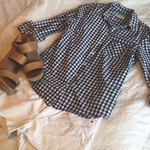 This Merona brand button up is the perfect compliment to any spring and summer wardrobe! The navy and white gingham print pair with olive, white, or denim for a casual look. Or throw it on with some bright pink or red shorts to amp up the style. So many options for this super affordable piece. Like new condition. Size XS. Listing is for shirt only.