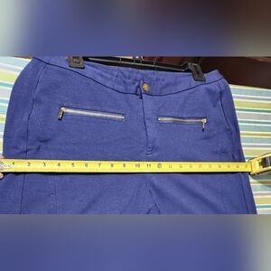 The zippers on the front are not functional. Measures 34' length waist is 17' The tag says the shell is 67% Rayon, 28% Nylon, and 5% Spandex. The lining is 83% Nylon and 17% Spandex.