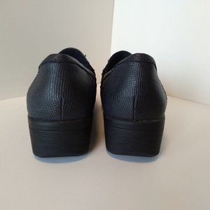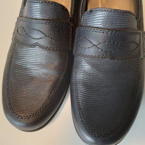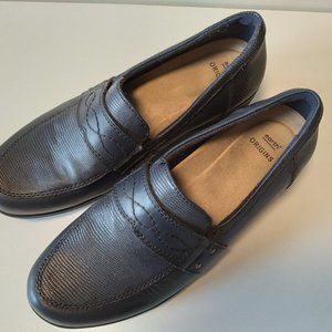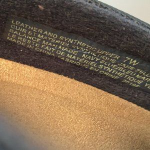 Earth Origins navy loafers, size 7W. Comfortable shoe in excellent condition, with suede-like insole and good arch support. Roomy toe-box. Great shoe for chunky socks! 1.5 inch wedge heel.
