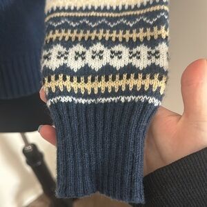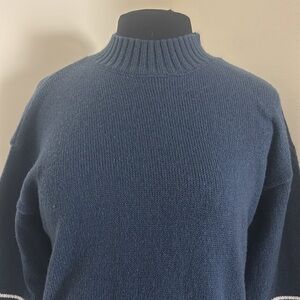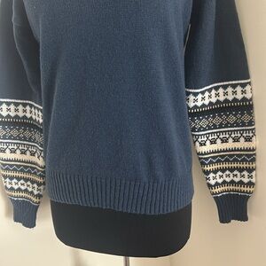 This is a navy mark neck sweater. It has a fair aisle detail on the lower half of the sleeves. It is a size medium. It is very soft and stretchy.