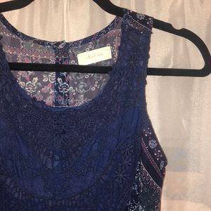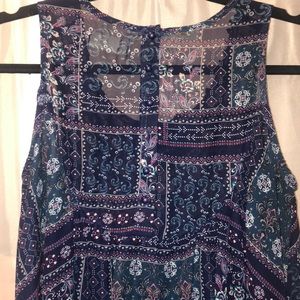 Loose fit blouse in a cute navy blue pattern. Women’s size S. Fits true to size. Has buttons halfway down back. Crochet detail in the front.