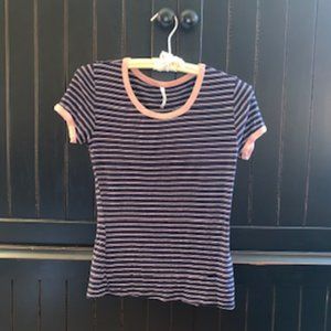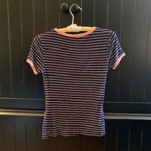 Gently loved short sleeve navy blue t-shirt with pink and white stripe pattern. Comfortable, stretchy and easy to wear.