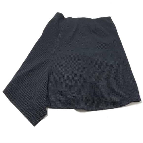 Navy skirt with tiny polka dots. Asymmetrical hem gives it an edge. Knee-length, has some stretch and elasticated waist.