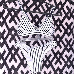 Comes as a set! So cute and comfortable. Bottoms are a little on the cheeky side. No stains or flaws. Top is a bra style with strappy detail.