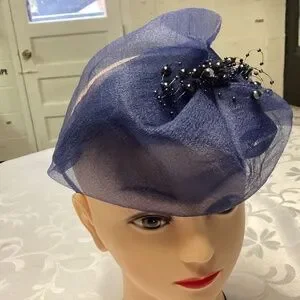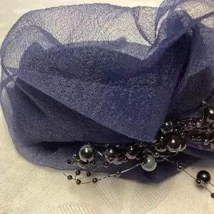 This is Rich navy blue very beautiful. It does say all handmade lovely lovely design. It’s a little difficult to measure, but I’ll give you the measurement the best that I can lie flat. It measures about 5 inches across tapped the bottom. It’s about 7 inches and then the stretch to it goes way way way out to about 8 inches. The netting is navy blue. The beads are beautiful lovely lovely vintage item. I have a burgundy one almost identical made by the same handmade person.