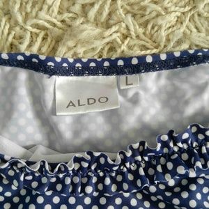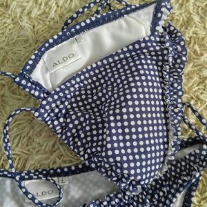 Navy with white polka dots and ruffles on both top piece and bottom piece. Top comes with removable pads. Size large but fits like a medium. Hardly wore it. Super comfy and casual! Willing to take any offers ??