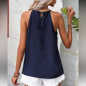 Navy blue high neck halter cami with cut out detail and ring at neck