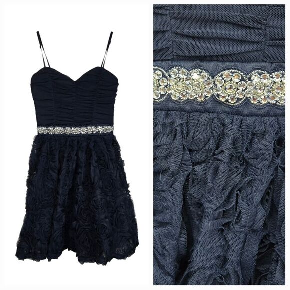 Stunning navy blue dress with ruched bodice. Features a sparkling silver rhinestone embellishment at the waist. Perfect for special occasions.