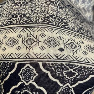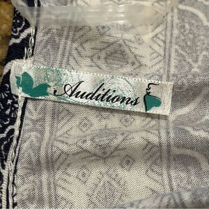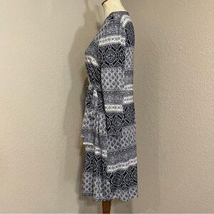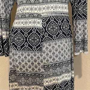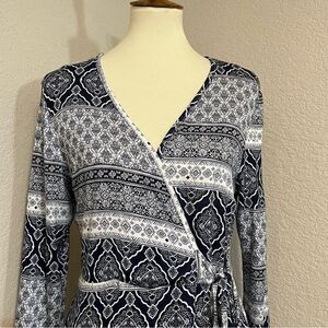 Super cute navy blue & white boho/tribal print dress in size large. Brand new without tags. Made in the USA. Long sleeves. Wrap style top with side tie. This is a faux tap, skirt is fully sewn together. Mid length. Slightly sheer when stretched. Photos are a part of the description. Color may vary with lighting or device.