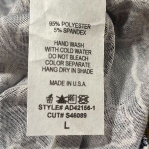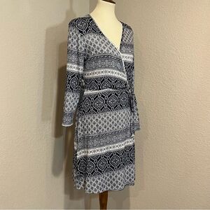 Navy Blue & White Boho Print Wrap Style Long Sleeve Dress Size L Made in USA