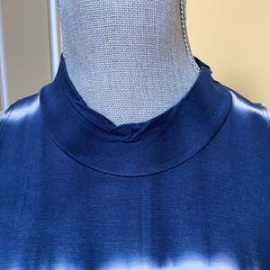 Pretty navy and cream dress has a tie dye look with a mock neckline. Sleeveless. A-line. Unlined. Cotton look and feel. 94% rayon, 6% spandex. Underarm flat across is 17”. Length is 35”.