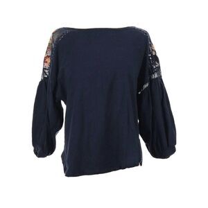 Navy Blue Floral Embroidered Top Balloon Sleeve Relaxed Fit Sheer Paneling On Shoulders Boat Neck 3/4 Sleeves