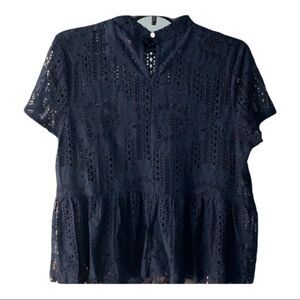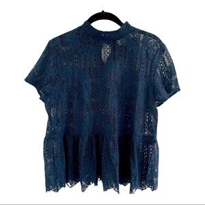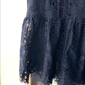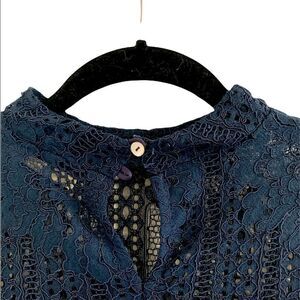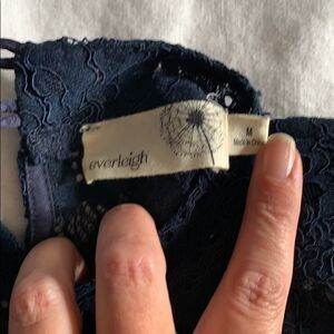 Sweet but sexy Everleigh navy blue lace top. Keyhole closure at back of neck. The neck strap closure is missing one tiny button, but you really can’t there’s supposed to be two buttons instead of one when you’re wearing it. Great with a bralette or tank top underneath, shows just the right amount of skin! NWOT, never worn.