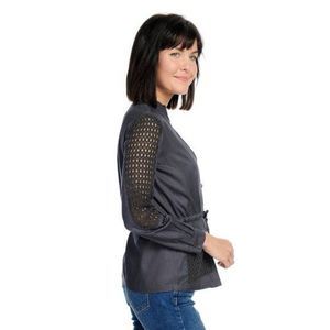 Navy Long Sleeve ZipUp Utility Jacket with Crochet Detail. Featuring mandarin collar, this jacket has long sleeves&buttons cuffs. The highlight of this jacket top is the striking crochet detail on the two front patch pockets and the two arms up to elbow length for an added flair. This jacket is made from soft and comfortable rayon. A great jacket to compliment your dressy or casual outfit. Gray available in separate listing.