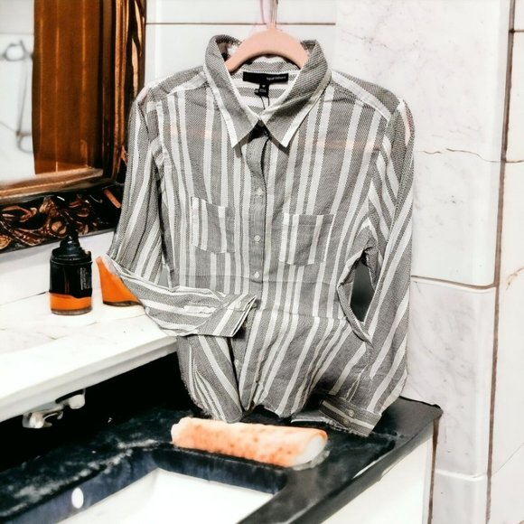 Navy/White Button Up Long Sleeve Blouse Women Teen Size M Office Casual Dinner