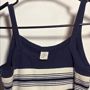 Stylish navy tank top with white stripes, perfect for casual outings. Comfortable and chic for everyday wear.