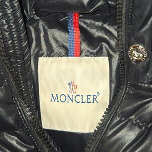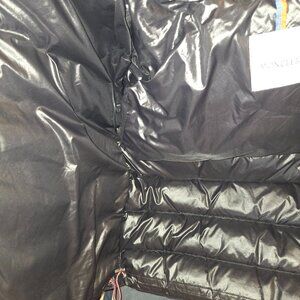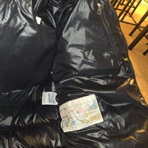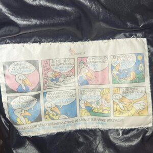 I have a slightly used navy-blue Moncler Pavin down jacket that's a size 2 (M) in US sizing that comes with a hood and shiny design. The jacket is in great condition and has a unique duck cartoon comic located inside of the left part of the jacket. The jacket has plenty of pocket space including inside storage and all zippers work perfectly fine. The jacket also can be turned into a puffer edition with its adjustable strings located on the bottom left and right side in the inside of the jacket. The material includes leather with nylon fabric and its extremely warm and insulated.